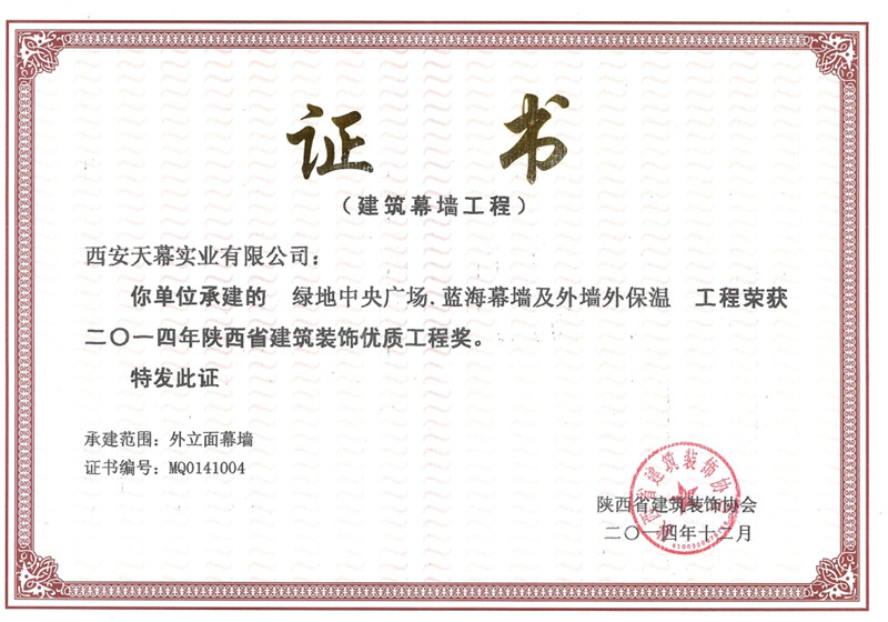 2014年度陜西省建筑裝飾優(yōu)質(zhì)工程——綠地中央廣場*藍(lán)海項目