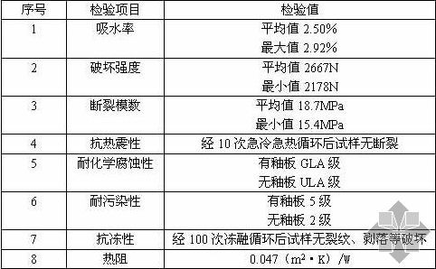 陶土板具有優(yōu)良的物理和力學(xué)性能。經(jīng)國家建筑材料測試中心依據(jù)國家相關(guān)標(biāo)準(zhǔn)的檢測試驗(yàn),其性能指標(biāo)可達(dá)到下表所示(樣板尺寸為:120×245mm)。