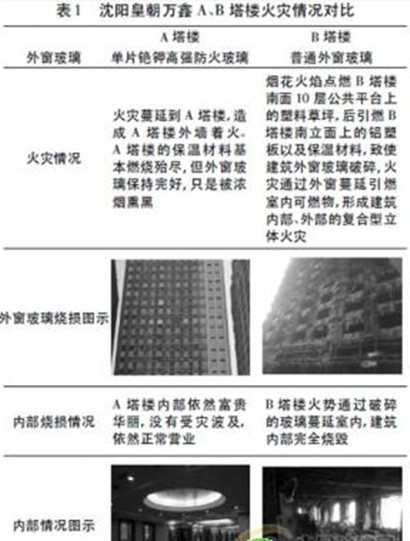 1988年美國洛杉磯第一洲際銀行大樓起火后,由于幕墻玻璃很快炸裂,火焰沿外墻上卷延燒,造成十分慘重的損失。1994年1月30日,上海滬西文化宮二樓火災(zāi),由于外墻面玻璃幕墻無防火處理,火災(zāi)10~15分鐘后幕墻框架構(gòu)件熔化掉落,玻璃炸裂,整個建筑全部受災(zāi)。2011年2月3日,沈陽市標(biāo)志性建筑沈陽皇朝萬鑫酒店由于燃放煙花爆竹引燃塑料草坪和可燃膠條引發(fā)了一起震驚全國的大火,B塔樓使用的是普通外窗玻璃,火災(zāi)蔓延B塔樓的保溫材料完全燃燒殆盡,外窗玻璃幾乎完全破裂掉落,B塔樓內(nèi)部完全被燒毀。A塔樓選用了單片銫鉀高強防火玻璃,火災(zāi)蔓延A塔樓的保溫材料完全燃燒殆盡,但外窗玻璃完好無損,A塔樓內(nèi)部沒有受到火災(zāi)影響,依然富貴華麗,依然正常營業(yè)。