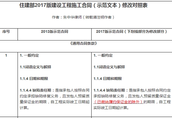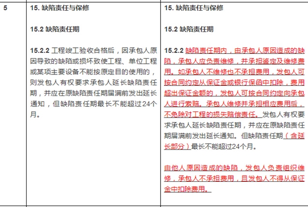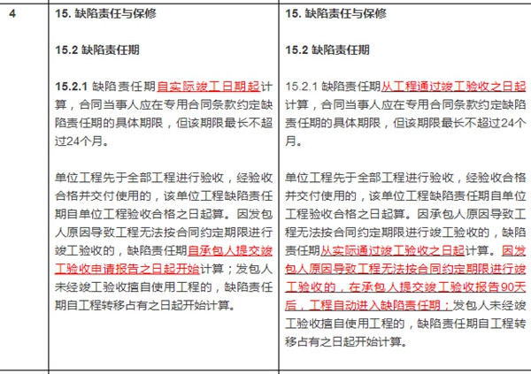 關(guān)于缺陷責(zé)任的具體內(nèi)容,2017版合同文本做了如下修改: