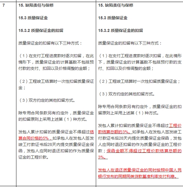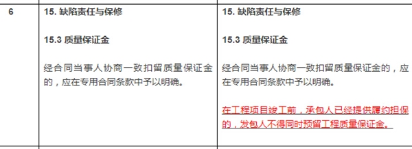 關(guān)于質(zhì)量保證金,2017合同文本在第15.3款【質(zhì)量保證金】、第15.3.2目和第15.3.3目進(jìn)行了以下修改: